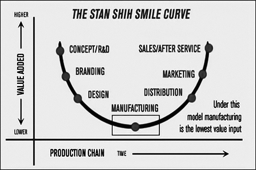 Trong nghiên cứu kinh tế hiện đại, hình ảnh đường cong nụ cười (smile curve) được lưu hành khá phổ biến, thể hiện các phân khúc cơ bản của chuỗi giá trị toàn cầu. Trong đó, các phân khúc có giá trị gia tăng cao gồm: nghiên cứu và phát triển sản phẩm (A), thiết kế sản phẩm (B), marketing (E - thương hiệu, giá cả, bán hàng...) và dịch vụ sau bán hàng (F). Các phân khúc như sản xuất (C) và lắp ráp (D) có giá trị gia tăng thấp hơn.