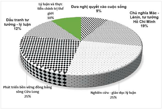 (3) Nghiên cứu - giáo dục lý luận: 221 bài viết, chiếm tỷ lệ 25,23% tổng số bài viết (Biểu đồ 1). Các bài viết đã đăng tải các nội dung nghiên cứu khoa học làm sáng tỏ hơn tính khoa học và cách mạng của chủ nghĩa Mác - Lênin, tư tưởng Hồ Chí Minh và đường lối, chủ trương của Đảng, chính sách, pháp luật của Nhà nước.